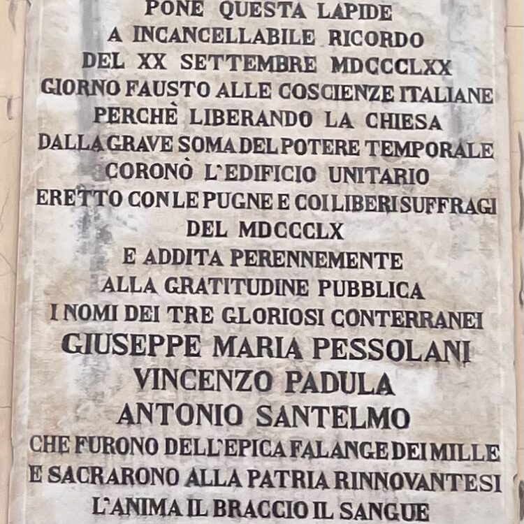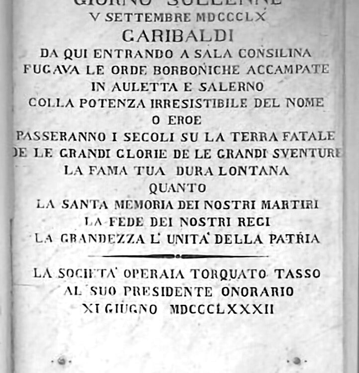 È l’epigrafe incisa sulla lapide che la Società Operaia “Torquato Tasso” volle apporre nel giugno del 1882 sulla facciata di una casa situata proprio nella via attraversata dal Dittatore Garibaldi, per ricordare che con la sua azione rapida e di sorpresa in breve lasso di tempo aveva determinato la fine di un Regno, promuovendo l’Unità d’Italia, che presto sarebbe stata realtà.