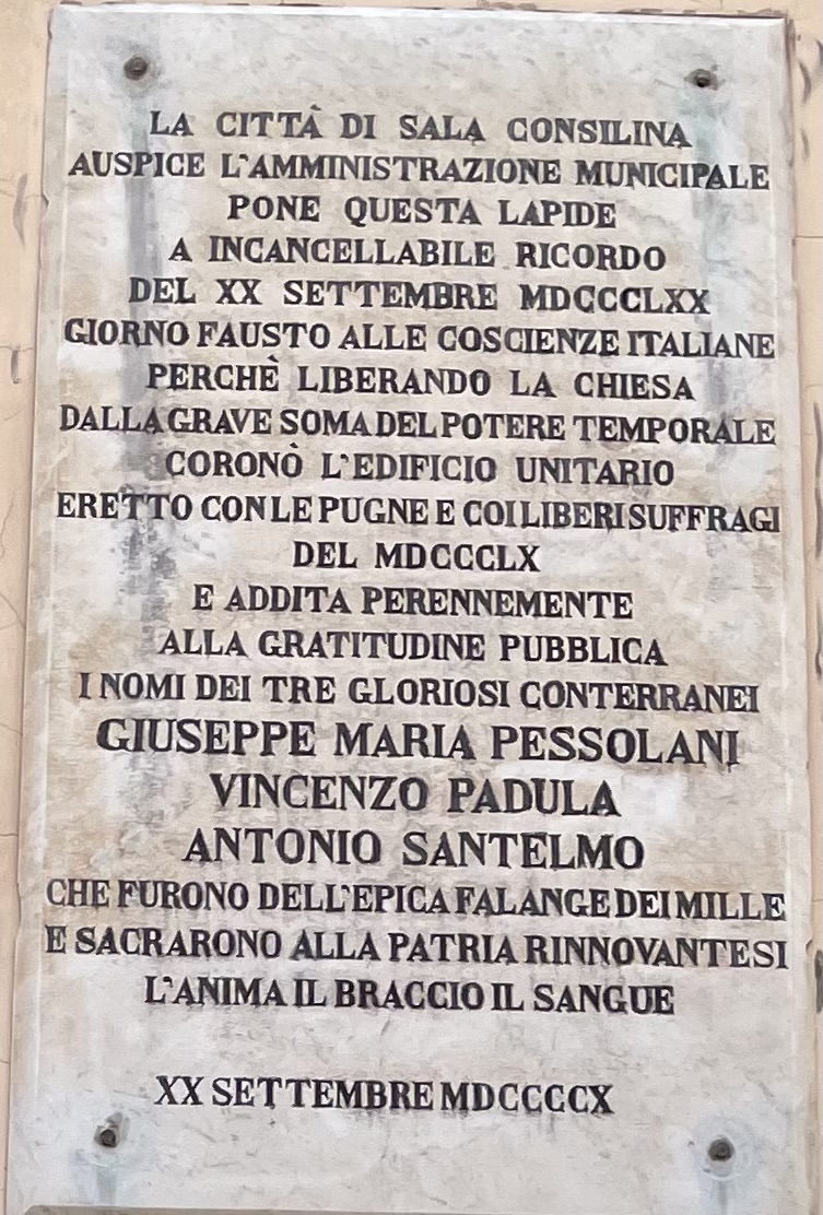 “Giorno sollenne (!) / V settembre MDCCCLX / Garibaldi da qui entrando a Sala Consilina / fugava le orde borboniche accampate / in Auletta e Salerno / colla potenza irresistibile del nome / O Eroe / passeranno i secoli sulla terra fatale / de le grandi glorie de le grandi sventure / la fama tua dura lontana / quanto / la santa memoria dei nostri martiri / la fede dei nostri Regi / la grandezza l’Unità della Patria.