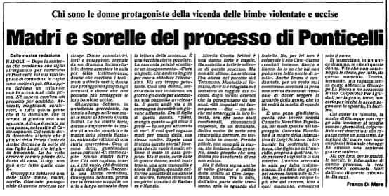 Non parlò del figlio non tentò di giustificarlo ma guardava alla realtà, alla sua famiglia distrutta, alla dignità infangata e calpestata. Chi non ha vissuto un dolore buio di questo tipo non può sapere cosa si prova. Una donna davanti a me, della mia altezza, lei si mi guardava in volto e lo sguardo era segnato dallo sgomento. Io dissi parole estranee a me stessa, presa da una profonda ansietà per tanta sofferenza. Ci tenemmo le mani, io non avevo fretta e lei voleva trattenermi. La rividi dopo una settimana, accompagnai una giornalista del settimanale “Noi donne” e il suo fotografo; le condizioni di quella madre e del figlio erano evidentemente peggiorate, parlavano poco e a bassa voce. A quarant’anni di distanza è stato ricostruito il delitto, attraverso materiale d’archivio e testimonianze inedite. La revisione del processo, sostenuta anche dal ex giudice antimafia Ferdinando Imposimato è stata chiesta – rinunciando a qualsiasi richiesta di risarcimento per ingiusta detenzione – per due soli motivi: “ripulire il proprio nome da quell’orrendo marchio d’infamia e mettere le manette ad un mostro che ancora cammina in mezzo ai bambini”.