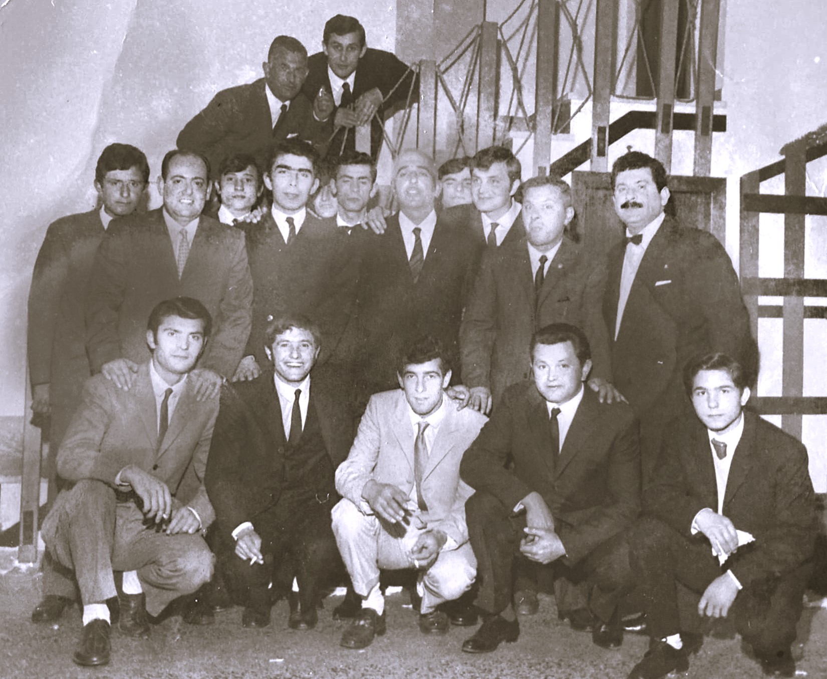 Sopra Michele Iovinella e Pinuccio Nola – in basso a sx Pierino Pericolo, quarto Saviuccio Fazio – al centro da dx il primo Alfonso Pericolo, terzo Sergio Fazio, quarto Peppiniello Canonico, sesto Pasquale Casillo.