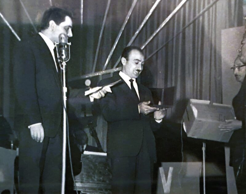 Condivido con molto piacere questa foto, gelosamente custodita dal mio papà. Sulla destra mio nonno, Vittorio Paladino, premiato da Corrado Mantoni e dalla RAI per la migliore vetrina (quella del Mobilificio Paladino) che vedeva protagonista la radio. Inizio anni ’60, Cinema Romano ex Miravallo.